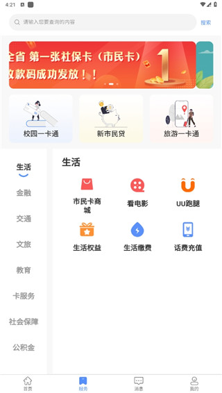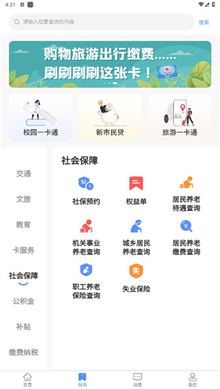 2、在服务中,可以看到有许多的功能,其分为交通、文旅、教育、社会保障等