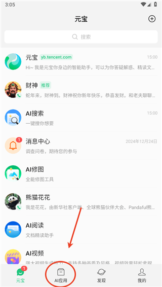 一、腾讯元宝ai生成视频教程1、进入腾讯元宝app之后,跳过前面之后,在主页点击“AI应用”;