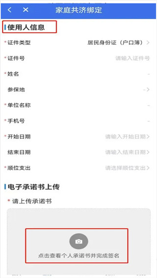 4、进入家庭共济绑定信息填写页面,根据提示填写“使用人”的个人信息,确认无误后,点击【查看个人承诺书并完成签名】