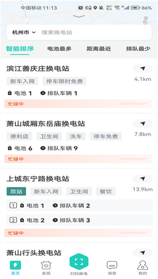 5、查找功能,可查询换电站基本信息、排队数量、电池数量、营业时间等;