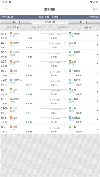 3、最后,在这里就可以看到当天还剩下的高铁信息