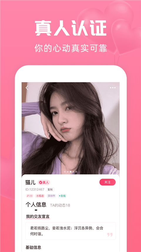 用户需要进行真人认证,拒绝各种虚假信息,专属标识帮你挑选心仪的聊天。