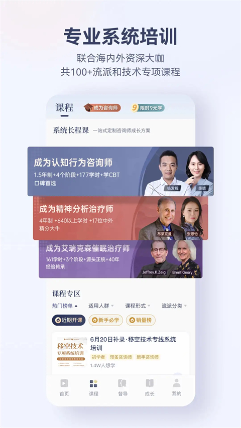 此外在咨询师之家app中还为大家提供了系统化的培训,覆盖了初、中、高等阶段的咨询课程,让你可以从最基础的理论知识学起,最后慢慢的运用到生活当中去,毕竟只有理论知识,不实践的话也是很难掌握的,如果你也对心理学这方面感兴趣,这款软件是你最好的学习伙伴。