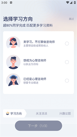 3、用户还能筛选感兴趣的学习议题,职场心理、个人成长、恋爱心理等等