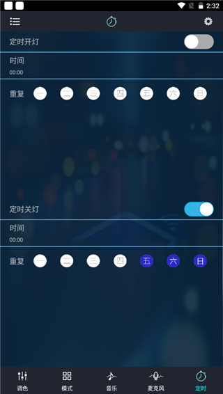 1、这里面提供了许多动态模式可以设置,用户可以根据需求自由选择。2、支持定时卡关灯,时间可以自由设置,还能选择重复的星期数。