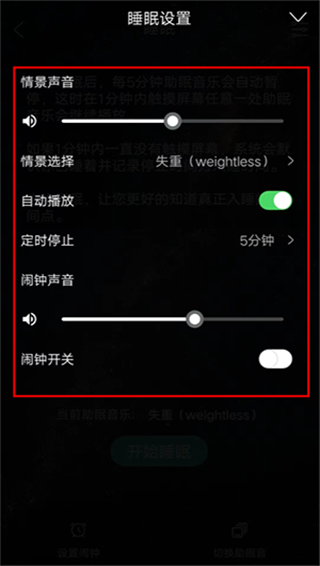 3、我们可以调节睡眠的参数,情景声音、情景选择、自动播放、闹钟声音等