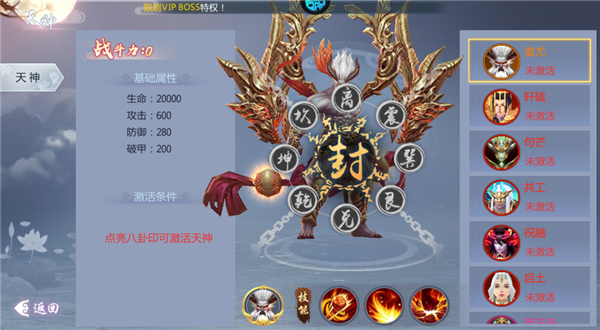 6、50级解锁天神觉醒,变身觉醒,使伤害大增,需要点亮八卦印就可以激活天神。