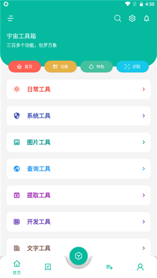 宇宙工具箱app最新版是一款非常实用的工具箱,这款软件中提供了许多工具可供大家使用,日常工具、系统工具、查询工具、开发工具、文字工具等,高达数百个功能,其中日常工具中提供了在线翻译、分贝仪、量角器、电子琴、指南针、万年历、qq变音等,用户可以根据需求自行使用。