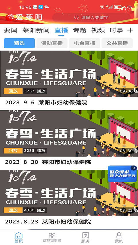 5、在爱莱阳app中交通频道与新闻频道的广播能够实时收听,能够以听取代看新闻。