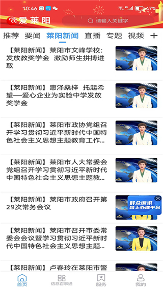 1、这里除了莱阳本市的新闻资讯外,还涵盖了国内所有的新闻热点。2、软件中内置了直播板块,各种类型的直播都可以在这里面看到。