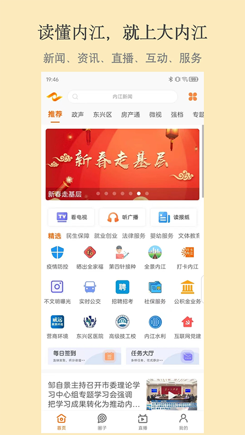 大内江app官方版是一款专为内江市民打造的资讯服务平台,这里面提供了本地的新闻热点,各种类型的资讯都能在软件内看到,美食、出租、招聘、求职、交友、美景、医疗、房产等等,用户可以根据自身的需求进行阅读,而且软件内还提供了多个板块,政声、微视、房产通、东兴区等,更是内置了海量的直播可供大家观看,如果你也喜欢阅读资讯的话,赶紧来本站下载体验吧。