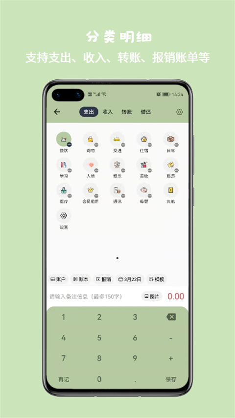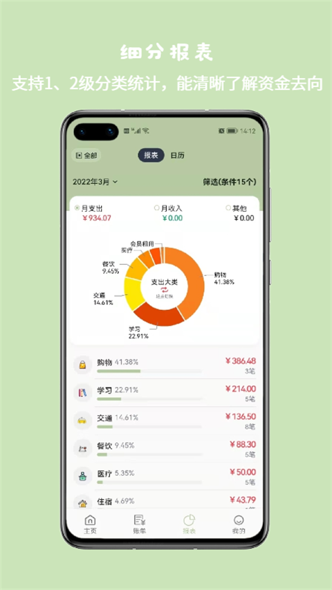 1、分类报表统计通过分类报表功能,可以直观地看到各类支出的明细和总额,轻松了解自己的花费情况。