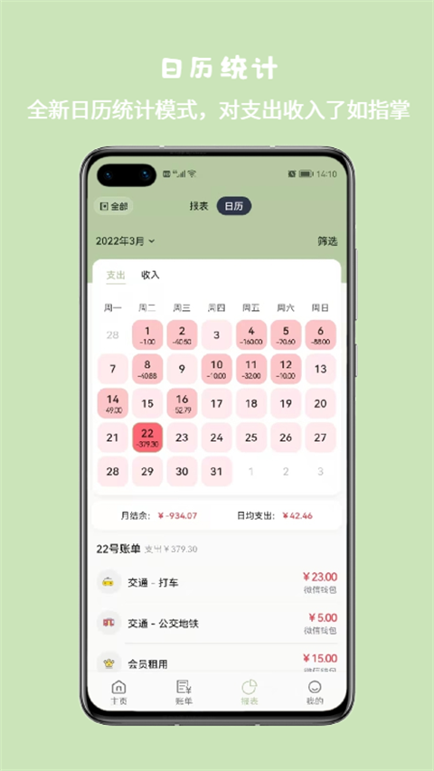 3、这里面有着日历板块,每天的支出收入可以了如指掌,你还能筛选类型哦。