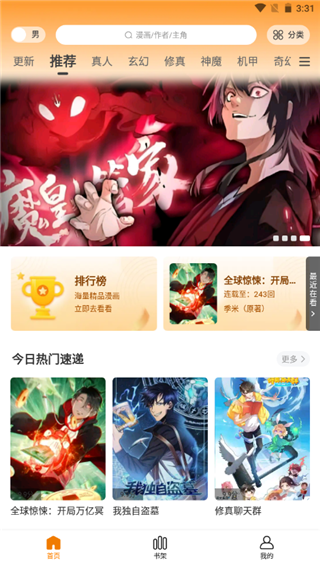 漫画星app是一款可以免费看漫画的应用软件,这里每天都会更新新的漫画内容,各种类型的漫画都可以在平台内看到,真人、修真、机甲、玄幻、奇幻、科幻、神魔等,只要你想看的漫画都能在软件内找到,而且这里还内置了漫画榜单,人气榜、好评榜、推荐榜、新书榜,致力为大家推送更多好看的漫画。