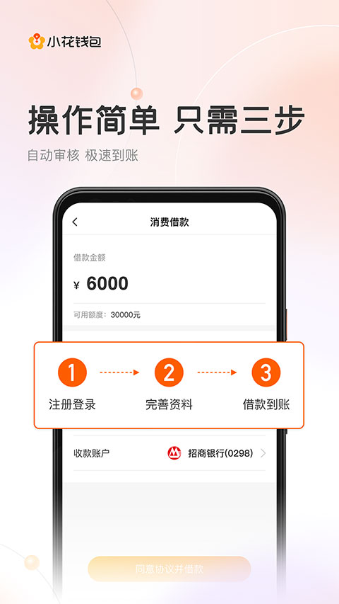 小花钱包app的申请流程非常的便捷,注册好账号后,填写好相关的个人信息和借款需求后就可以申请借款了,操作简单,只需要三步,审核通过后即可快速将资金打到你的账户中,无需繁琐的流畅,非常的方便。有需要的朋友快来本站下载软件使用吧。