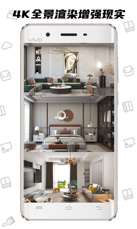 1、装修效果图喜云app内支持极速三维摆放,快速高清渲染,真实房型尺寸,一键渲染效果图和全景图,鸟瞰图,漫游图。