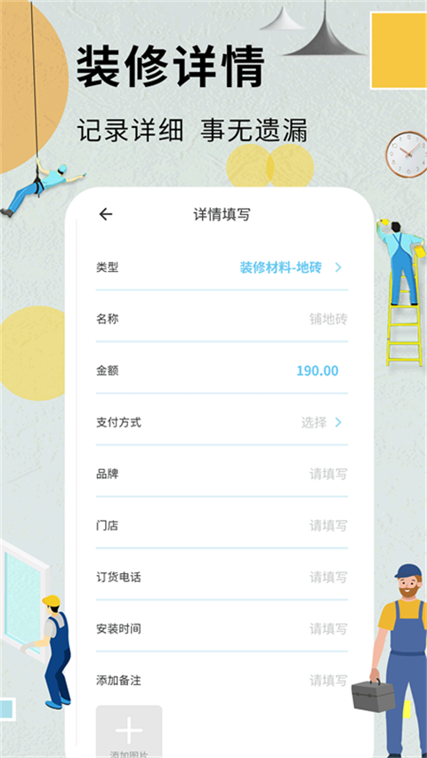装修记账本app是一款非常方便的装修记账软件,能够帮助用户对于自己想要装修时产生的各种费用进行明确的管理和安排,让你知道装修的各个方面的开销,以便于严格控制费用,达到省钱的效果!在这里你可以将装修时候的每一项花费都牢牢记在账本上,分析具体的时间段装修费用,从而把控好接下来的装修进度,避免工期的延误!同时当你通过装修记账本app来养成记账的习惯时,你也将把握更多的细节,例如各种材料、人工、时间、家居等等,这样再后面的装修方案中就可以进行不断优化了!