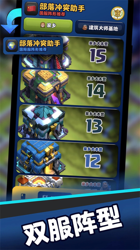 双服同步!我们精挑细选了近两千个国服、国际服阵形,并手动制作了该阵形在另一服务器的阵形链接!护资源、冲杯、部落战、创意、升级阵形应有尽有!