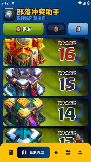 部落冲突助手app是一款专为部落冲突玩家们打造的阵型复制软件,通过它就能复制出不同的塔防阵型,这样即便是新手玩家也能套用模版,创造出更适合自己的阵容了!不仅如此这款软件囊括的阵型链接非常丰富,像资源阵型、冲被阵型、部落战阵型和创意阵型等等,应有尽有,切实满足不同玩家的阵型搭配需求!此外这款软件还为玩家们带来详细的升级数据,像各种建筑设施、兵种、英雄等升级数据都包含在内,所需要花费的时间和资源也是一目了然,保证你能够将自己手上的资源进行最大化利用!总之拥有了这款方便的辅助工具,一定能够帮助你部落冲突这款游戏中获取更好的胜利!对此感兴趣的小伙伴快来下载吧!