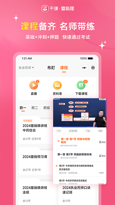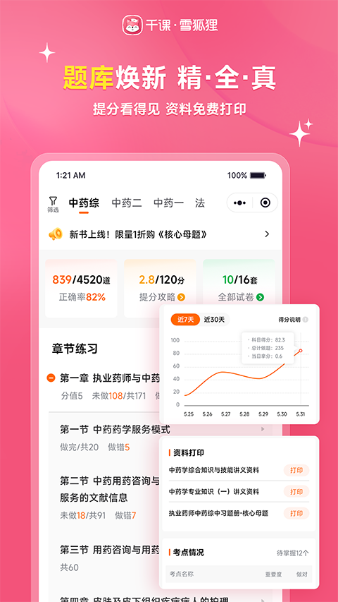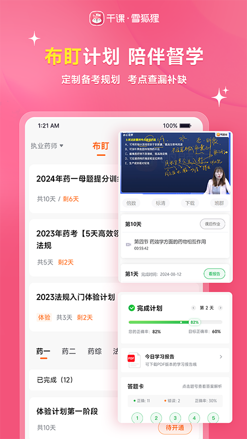 1、名师直播:行业知名讲师教学,易学易懂,筛选考点知识逐一突破2、大数据题库:实时检测做题数据,做题完成题目数,做题正确率