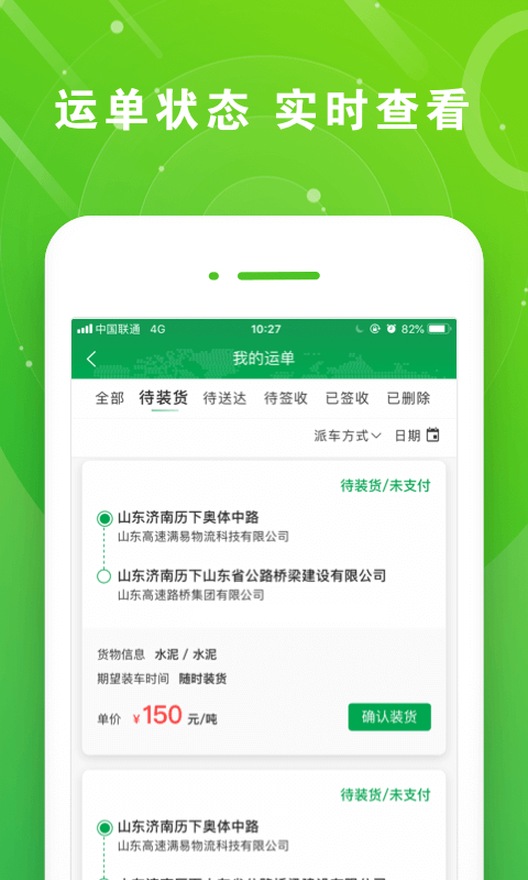 1、货源:海量货源,随时随地,找货配货;2、运单:货主指定运单,在线装货卸货,状态实时查看;