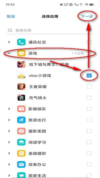 4、“选择应用”点击“游戏”,下拉中勾选“秒玩笑游戏”,点击“下一步”;