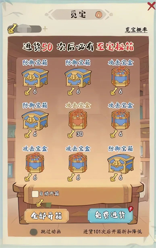 墨客们可以消耗道具(文玩钥匙)开启装有珍宝的箱盒,然后获得其中的珍宝,每日可免费进货3次,每日进货达到指定次数后会降低开箱折扣,增加开箱消耗