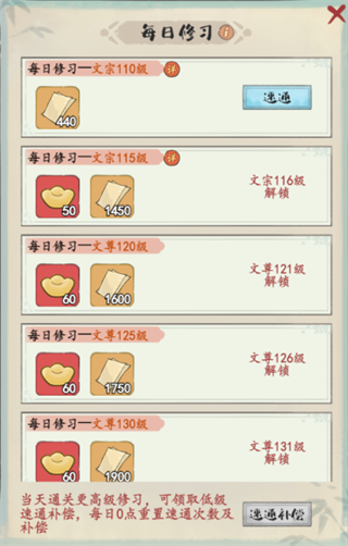 一、每日修习1、每日修习是获取宣纸的重要途径,修习奖励分为首通与速通奖励,首通奖励仅第一次通关后获取,通关后关卡变为速通关卡,每日可免费速通一次,消耗元宝获取5次,元宝消耗量随着速通次数的增加而递增,最终可获取到【速通收益】*【速通次数】的等量宣纸