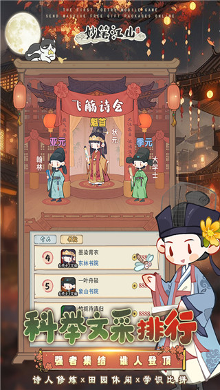 妙笔江山手游是一款休闲向的角色扮演手游,采用了Q版的画面风格,无论是人物设计还是场景布置都给人一种非常萌趣的意境!在这里玩家们将穿越到仿佛如同古代的诗词世界一般,你可以尽情与友人把酒言欢,谈论古今,也能够享受种豆南山下,草盛豆苗稀悠闲,这里没有任何任务、系统的限制,每个人都能够在这里找到属于自己的趣味玩法!此外该妙笔江山手游玩法以赋诗为主,通过不断收集不同的诗词来提升自己的实力,而每一首诗句都蕴藏着独特的力量等待玩家去探索,而且游戏中设计了行万里路、书山试炼、舌战群儒、诗仙试炼等多种玩法,让你能够陶冶其中,享受古典文学的魅力之处!