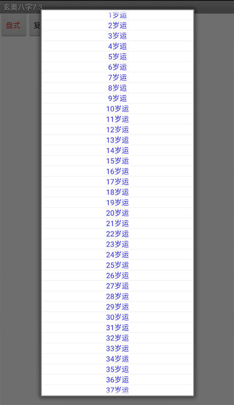 点击上面的“运气”旁边的列表,可以查看未交大运、各步大运的详细分析,还有其他更多分析解说。