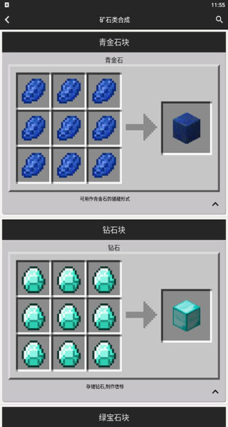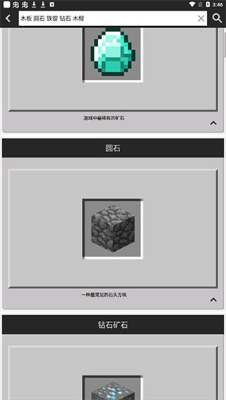 3、展示游戏中合成的各种物品: 应用展示了如何在游戏中合成各种物品,包括常见的物品、建筑、装饰、染料、食物、照明、矿石、红石、运输、工具、装备、附魔武器、药水等。