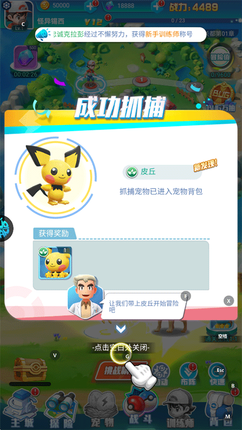5、恭喜你,成功抓捕到一只宝可梦精灵——皮卡丘;