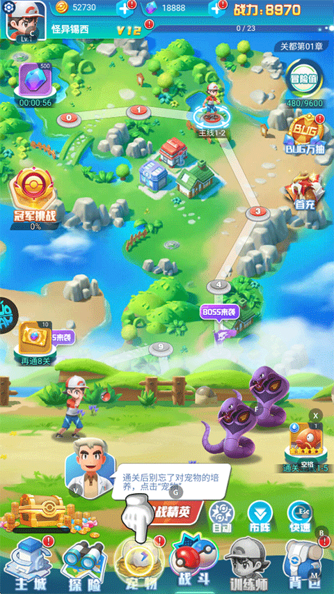 【轻松挂机·释放双手】进阶训练师可提高挂机收益,小精灵还可自动战斗,精灵世界永不离线!多样丰富的冒险体系,快来召集精灵踏上成为最强训练师的冒险之旅吧!