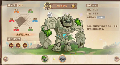 3、石阵巨像——没啥用(玩具),可能用于针对弱地高攻精灵,满血满物防种族值,小技能血量决定伤害,大招物防决定伤害