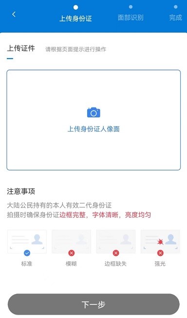 2、点击上传身份证正面,上传成功后,进入下一步。