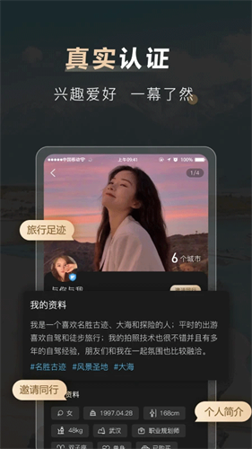 1、今天你和相同爱好的人聊天了么,感情,是聊出来的,不聊,自然就淡了。2、真人认证超靠谱,严格核查身份,杜绝虚假信息,让你放心结交旅伴,开启安心旅途。