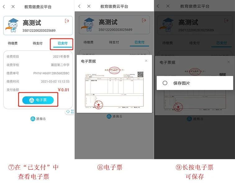 1.若已退出后,可再次进入教育缴费,通过学生身份号进行查询,在“已支付”中可以查看电子票。