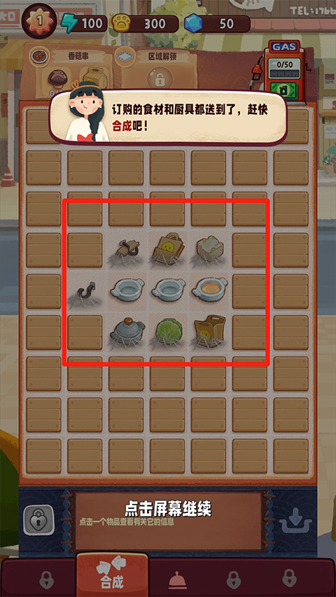 3、如图,订购的食物和厨具都在方框里了,可以开始合成了,