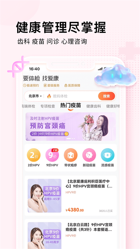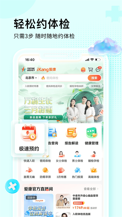 爱康体检app是一款健康服务软件。用户用手机就能轻松预约全国大城市里数百家体检中心的体检服务,在预约的时候,可以自由选择体检的时间和想去的分院,特别灵活。而且app还推出了好多有针对性的体检套餐,像爸妈体检套餐,专门为长辈们的健康需求设计,女士甄选套餐,聚焦女性健康问题,男士精英套餐,则贴合男士的生活和工作特点,不管你是孕检人群,想快速找到适合自己的专属项目,还是企业用户,要批量给员工安排体检,它都能满足。