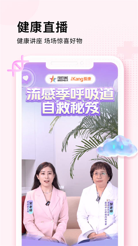 1、内包含大咖讲堂、直播、图文资讯等内容,帮助用户了解更多健康知识。2、支持管理本人及家人的健康内容,营造家庭健康管理氛围。