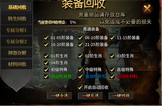 回收前仔细确认装备,避免误回收有用装备。开启自动回收功能时,设置好回收条件,防止将有价值装备误回收。