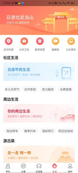 3、点击吕梁通,里面为用户提供生活缴费、智慧税务、东义天然气、中服免税、慢病服务等等;