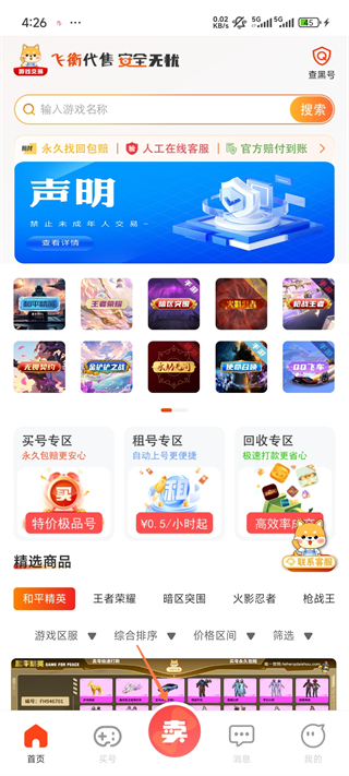 飞衡代售app官方版是一款账号估价回收软件。谁的游戏账号库里没藏着几个压箱底的闲置号?放着占地方,卖又怕麻烦,自己挂平台得跟买家斗智斗勇砍价,还可能遇到到手就挑刺砍钱的糟心事,这款软件直接甩出一键估价加快速回收的组合拳,上传账号截图,AI秒速扫描装备、皮肤、段位,像超市扫码结账一样自动算出合理价,连限定道具的稀有度都给你算得明明白白。