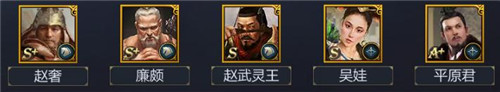 赵国初始阵容,廉颇无敌防护技能保护前排,平原君优先攻击敌方力量最高的武将,前期过图效率一般但是可以兼顾国战,并向高级阵容转型。