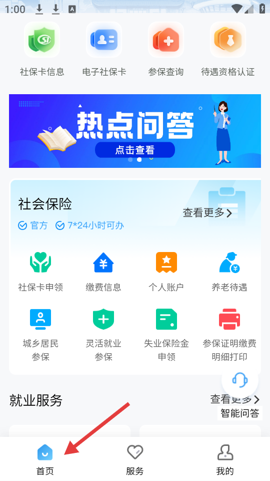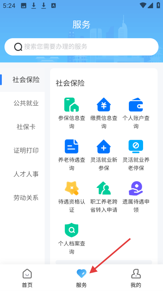 3、服务页面展示,提供搜索框,分类呈现社会保险、公共就业等服务,含参保缴费等查询办理项。