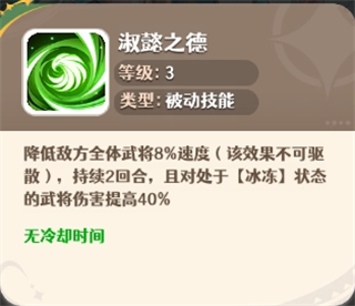 降低敌方全体武将8%速度(该效果不可驱散),持续2回合,且对处于【冰冻】状态的武将伤害提高40%