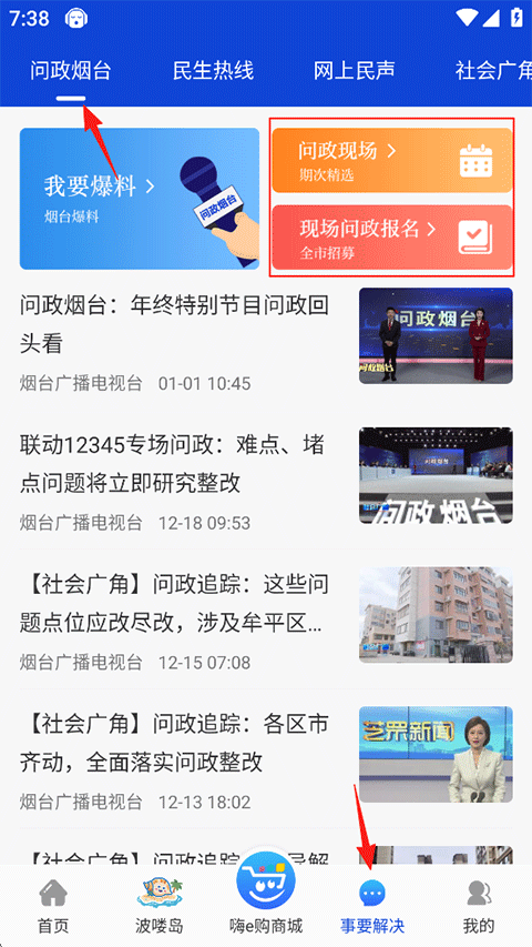 1、打开APP,点击事要解决-问政烟台-问政现场/现场问政报名;