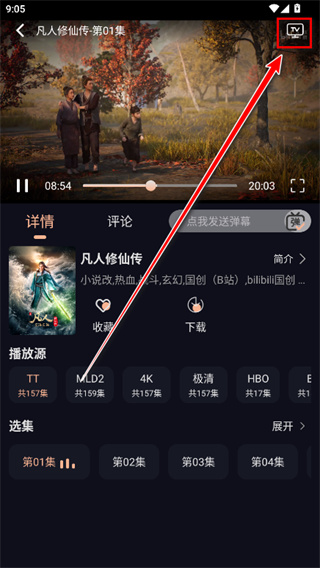 2.点击小编用红色箭头指向的的tv投屏符号。