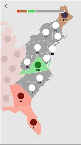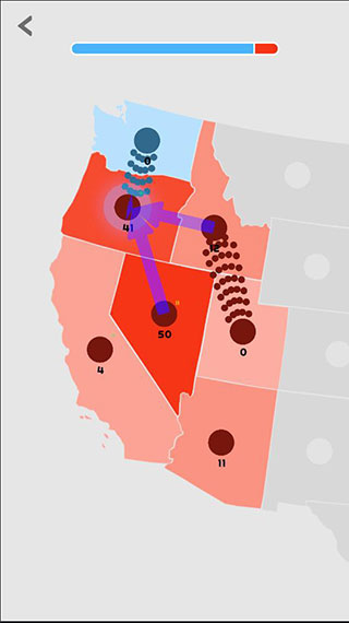 5、后期的关卡会增加更多的势力,每个颜色代表不同势力,也都是各自为战,这就使得游戏更加具有策略性,你不再是面对一个敌人,而是要在这犬牙交错的形势中周旋。