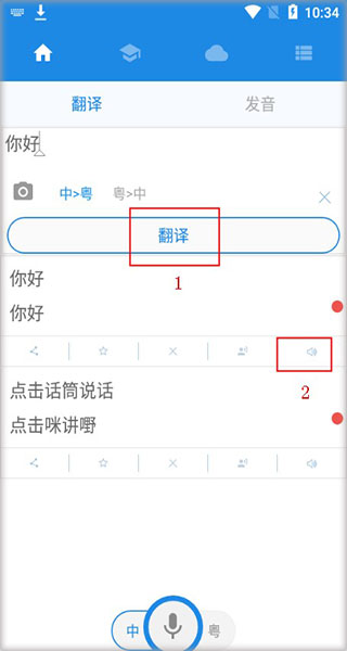 2、然后点击翻译后下方显示已翻译好的话筒,点击喇叭即可播放;